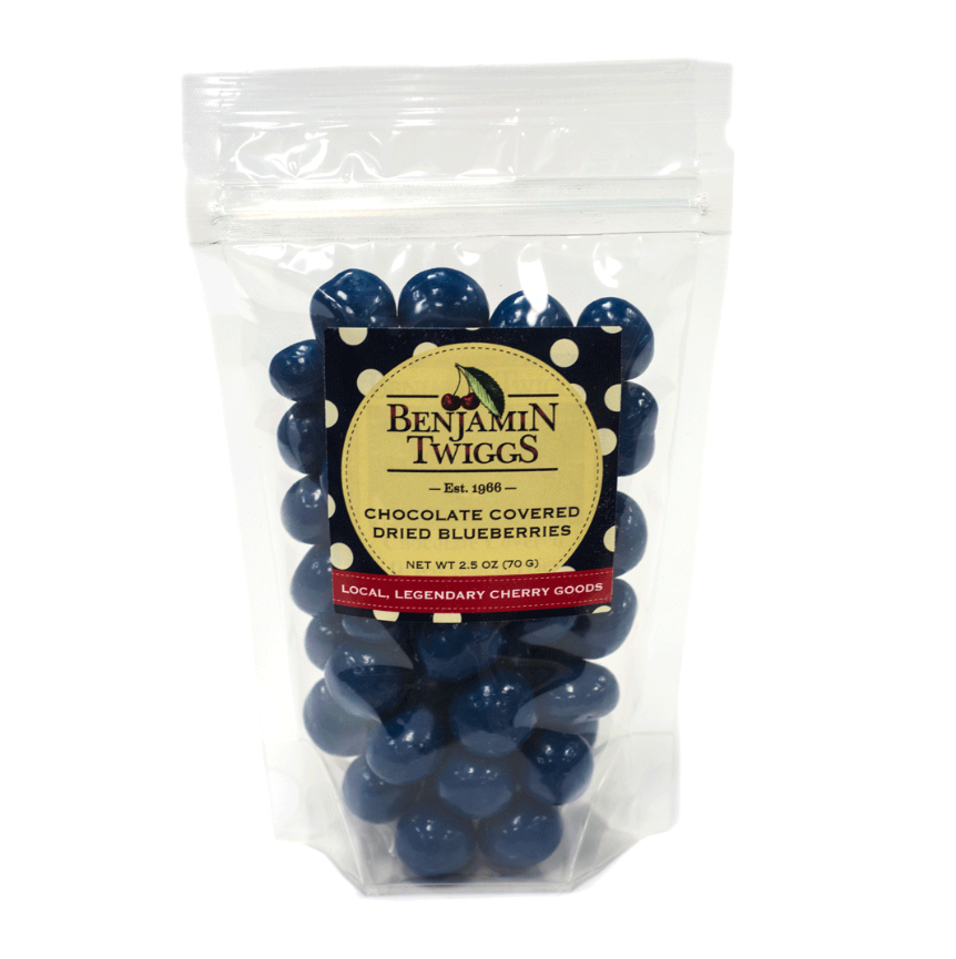 Dried blueberries dipped in rich milk chocolate and again in blueberry white chocolate. Sweet!