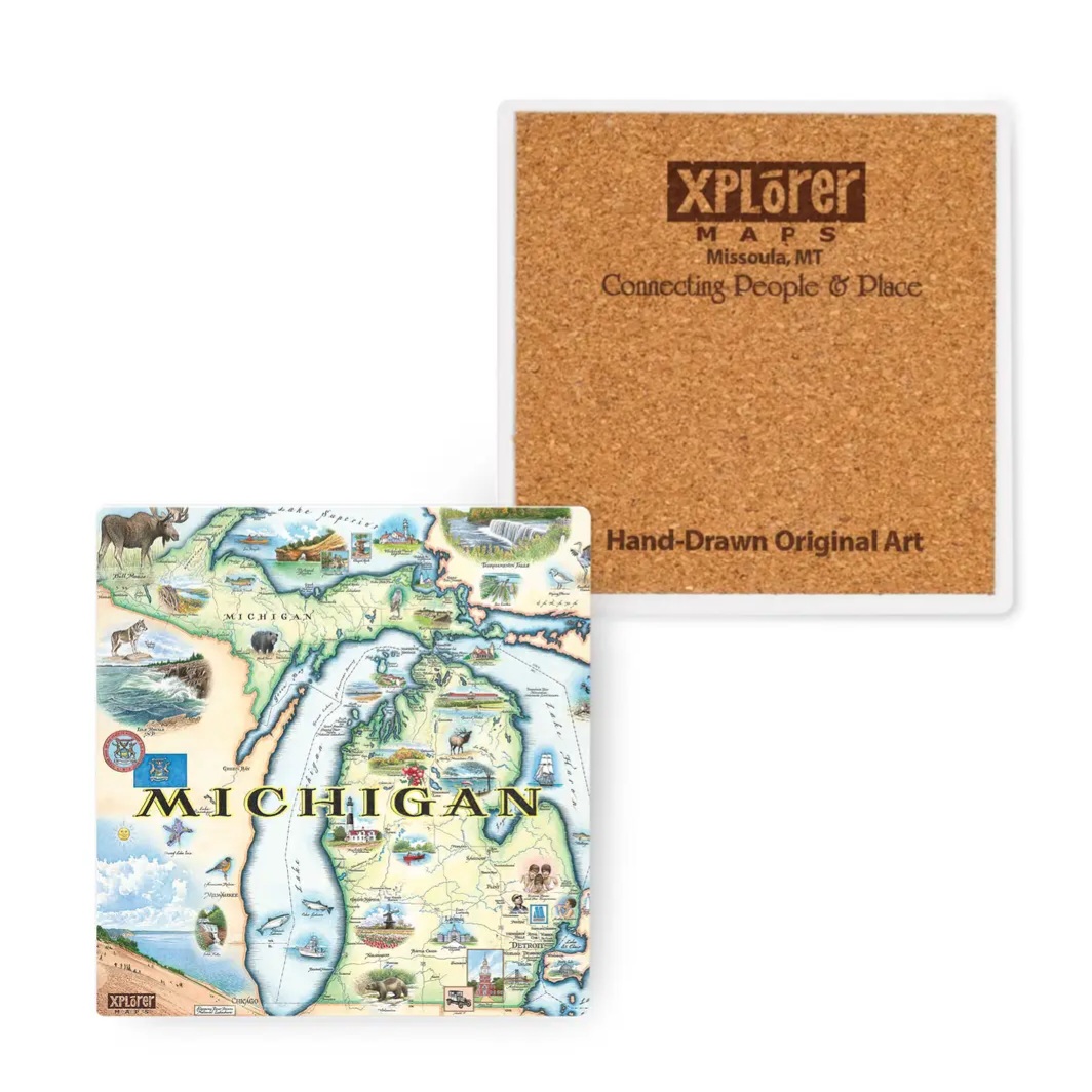 Celebrate the Great Lakes State with our handcrafted ceramic coaster, featuring a beautifully detailed hand-drawn map illustration by Xplorer Maps.