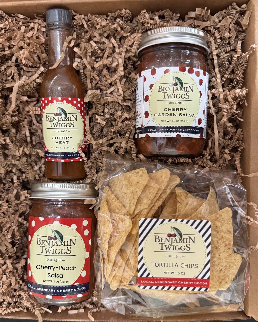 One box. Two incredible salsas (including our NEW cherry-peach salsa), chips, and heat.